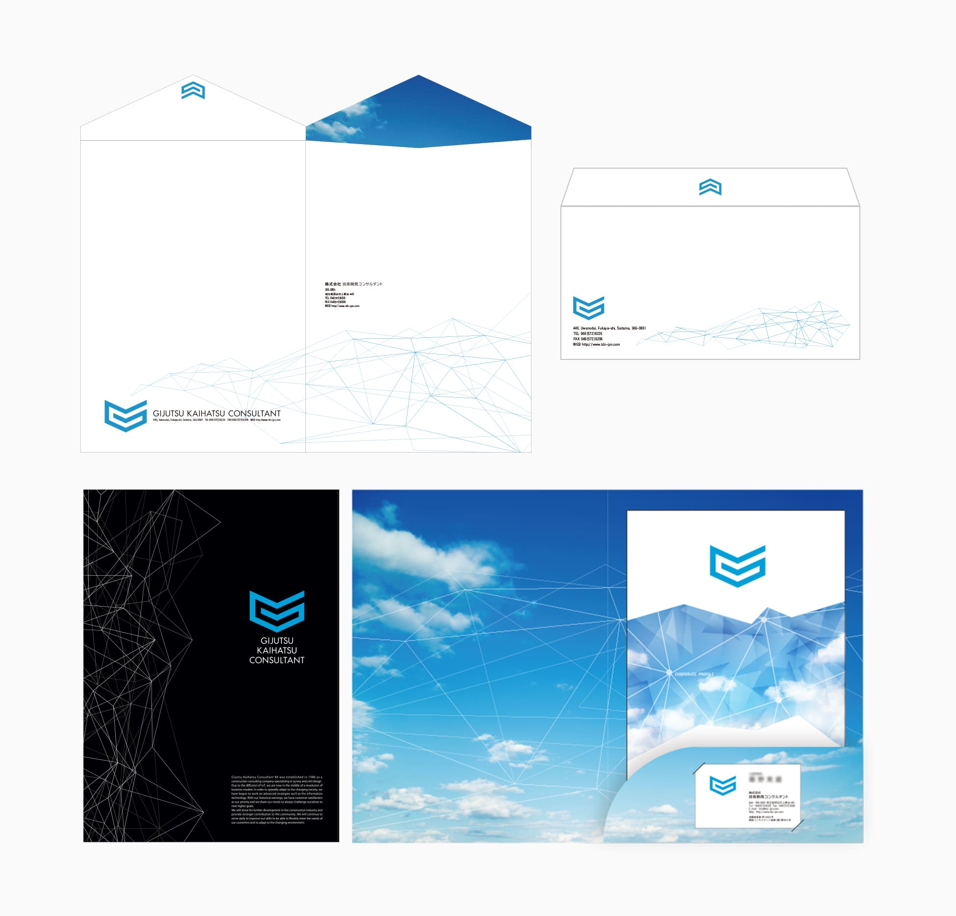 ロゴマークは「G」をモチーフに先進的な測量技術の鋭角なフォルムを表現し、空高く舞い上がる「翼」をイメージしています。このフォルムと「空」をイメージする青を様々なツールに展開し、統一されたブランドイメージを構築しました。